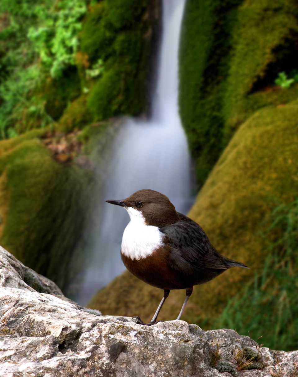 El Mirlo Acuático es un pequeño pájaro de río que se encuentra en Europa, el norte de África y Asia. Se caracteriza por su pecho blanco contrastante, su cuerpo marrón oscuro o negro y su habilidad única para sumergirse y caminar bajo el agua en busca de insectos y larvas. Habita en ríos de aguas rápidas y limpias, donde anida en grietas rocosas o detrás de cascadas. Es un excelente indicador de la salud de los ecosistemas acuáticos.